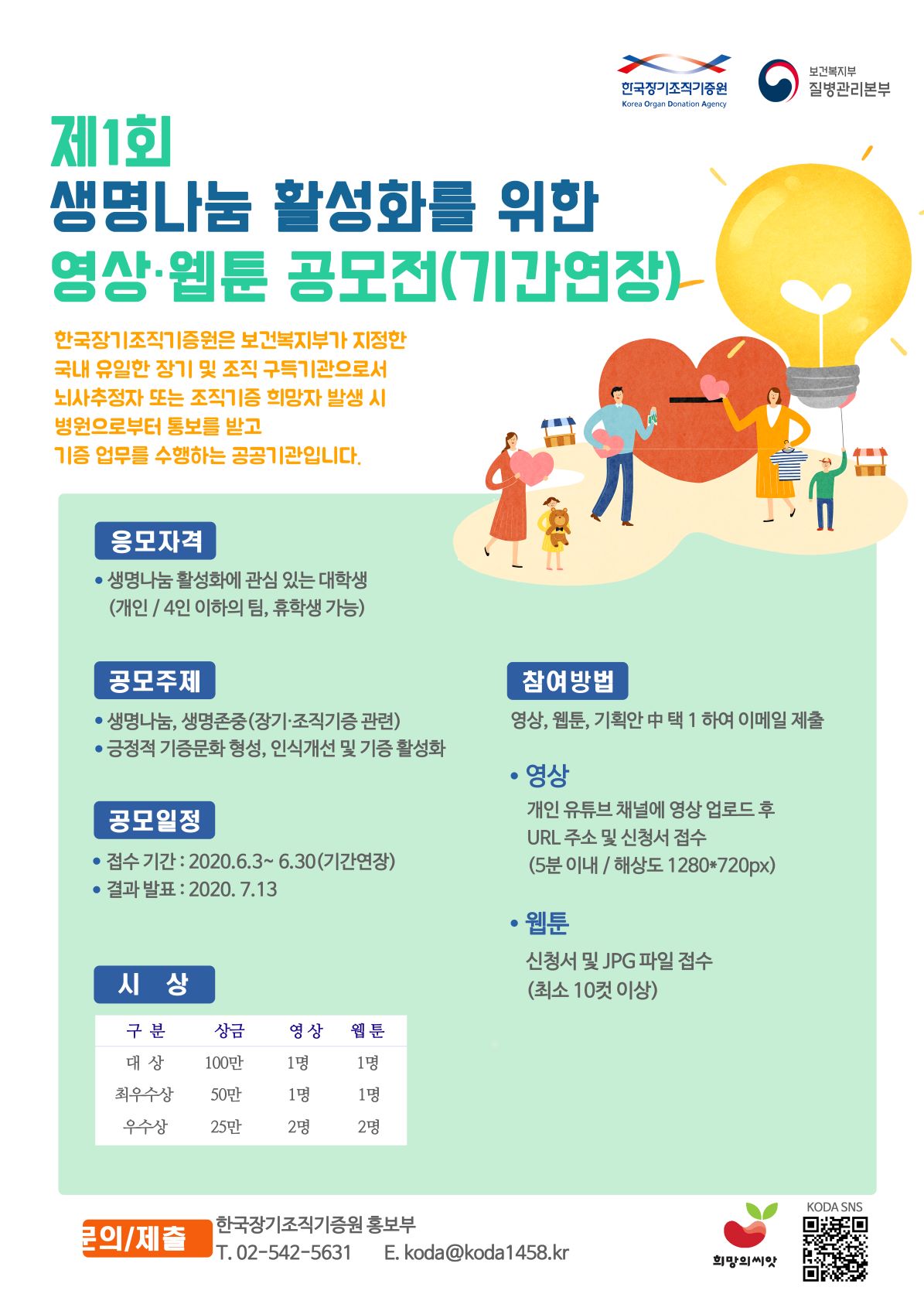 한국장기조직기증원에서 개최하는 「생명나눔 활성화를 위한 제1회 영상‧웹툰‧아디어 공모전」의 기간이 연장되었습니다.