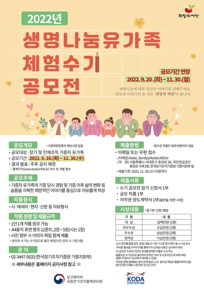 2022년 생명나눔 유가족 체험수기 공모전(기한 연장)