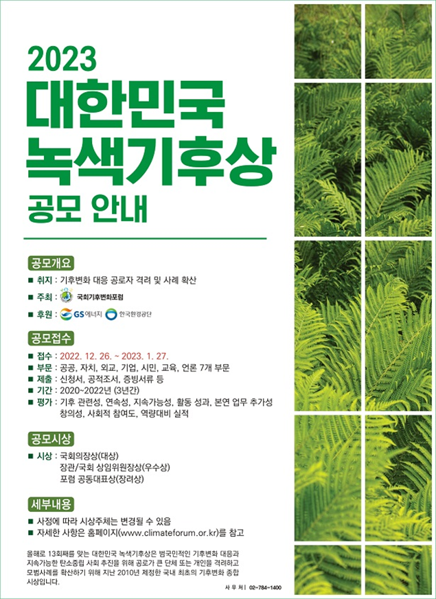 [국회기후변화포럼] '2023 대한민국 녹색기후상' 공모 알림