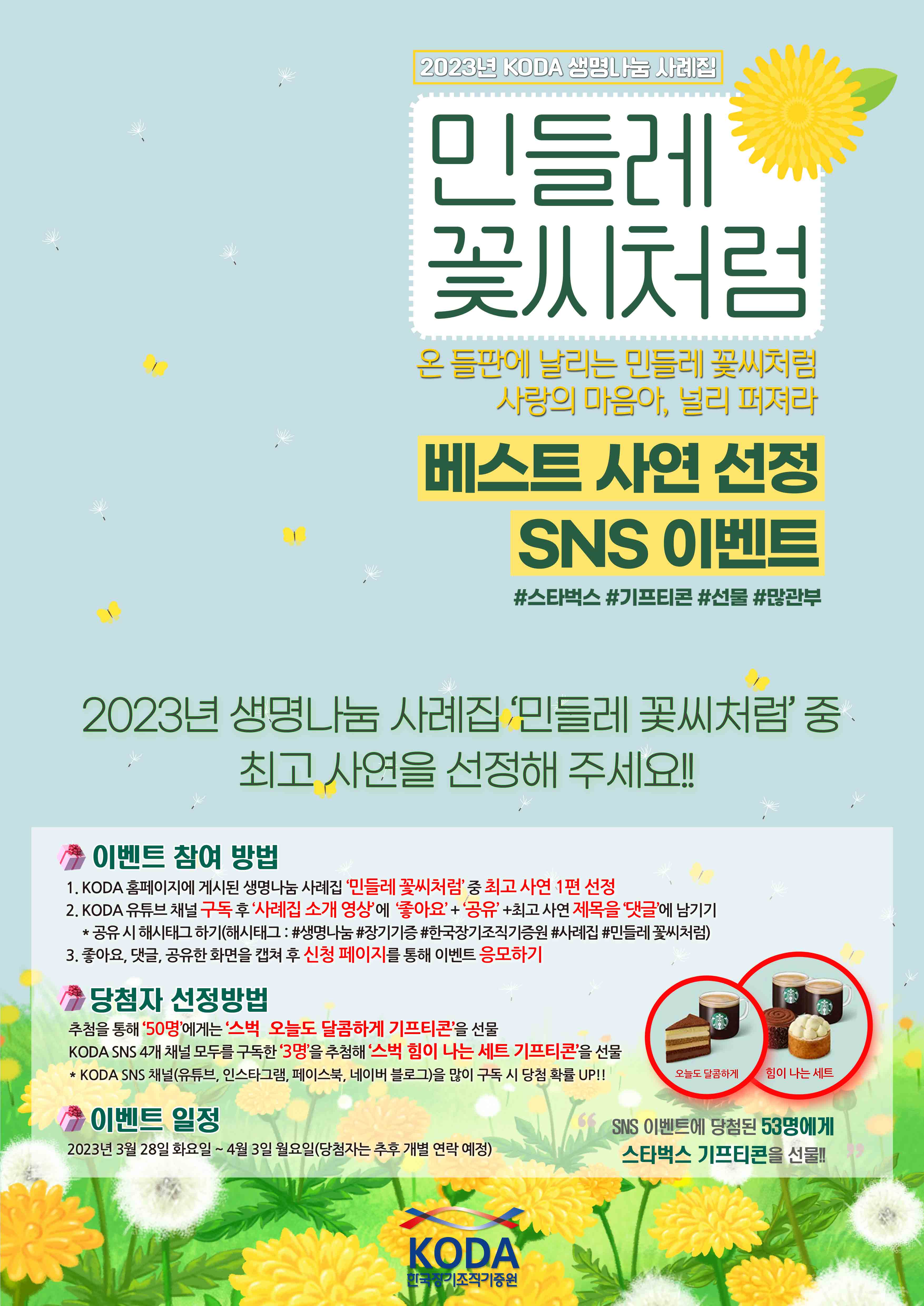 KODA SNS 4개 채널 모두를 구독한 ‘3명’을 추첨해 ‘스벅 힘이 나는 세트 기프티콘’을 선물
