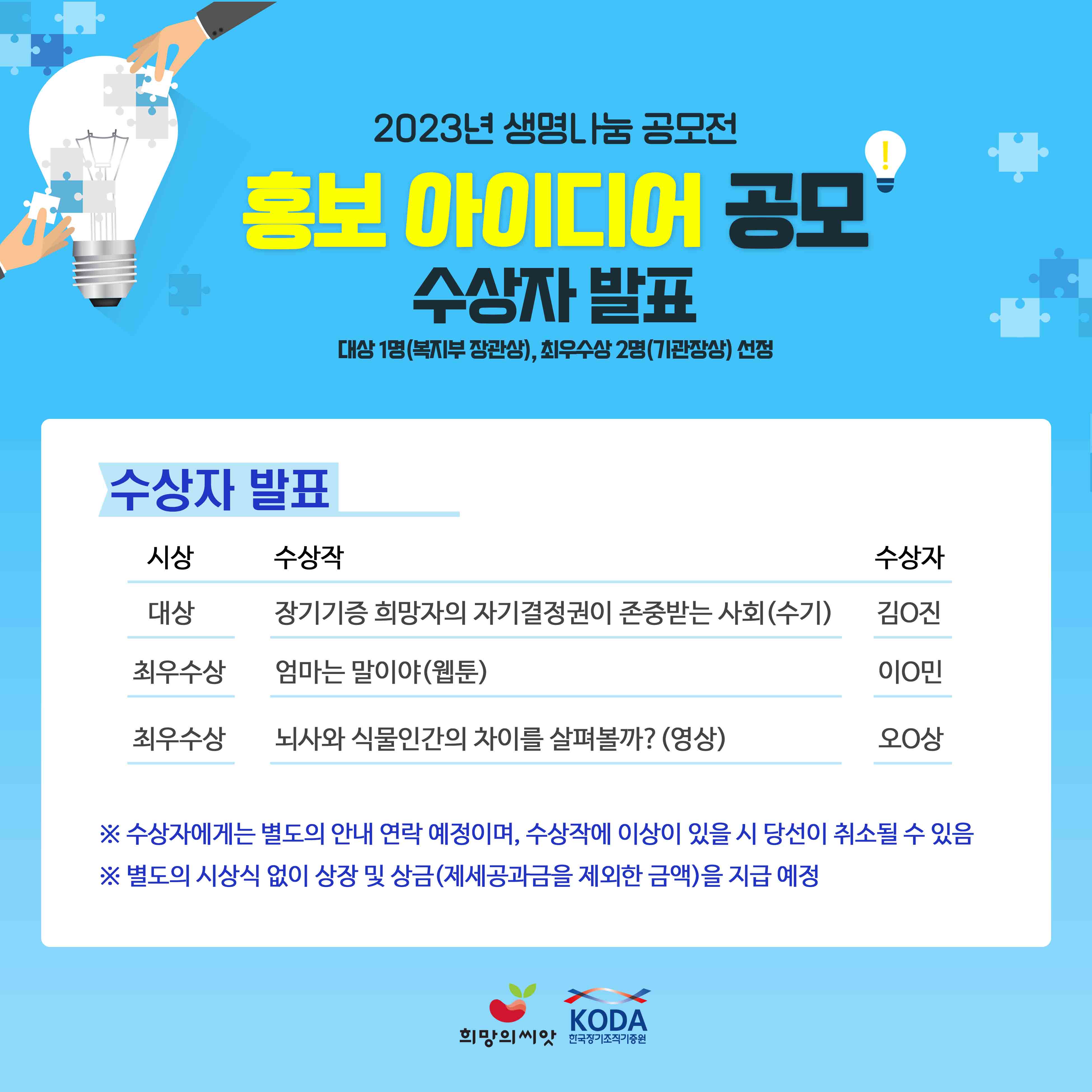 2023년 생명나눔 홍보 아이디어 공모전 수상자를 발표합니다.