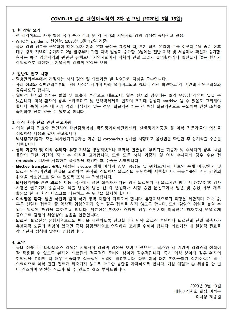 대한이식학회 2차 COVID-19 관련 권고안