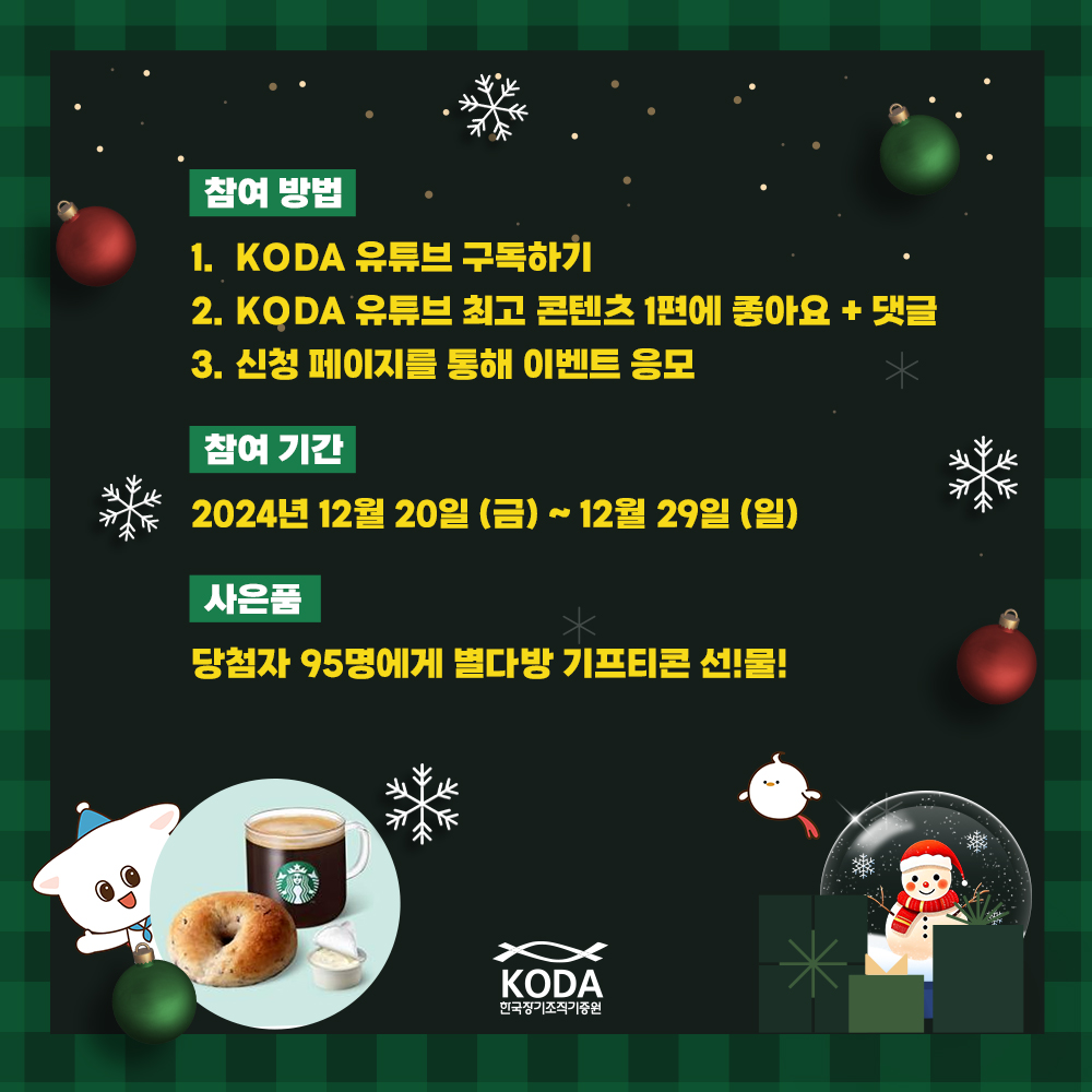 KODA 유튜브 콘텐츠 중 최고의 콘텐츠를 뽑아 댓글과 좋아요를 남기면 맛있는 커피와 디저트가 찾아와요!!^^