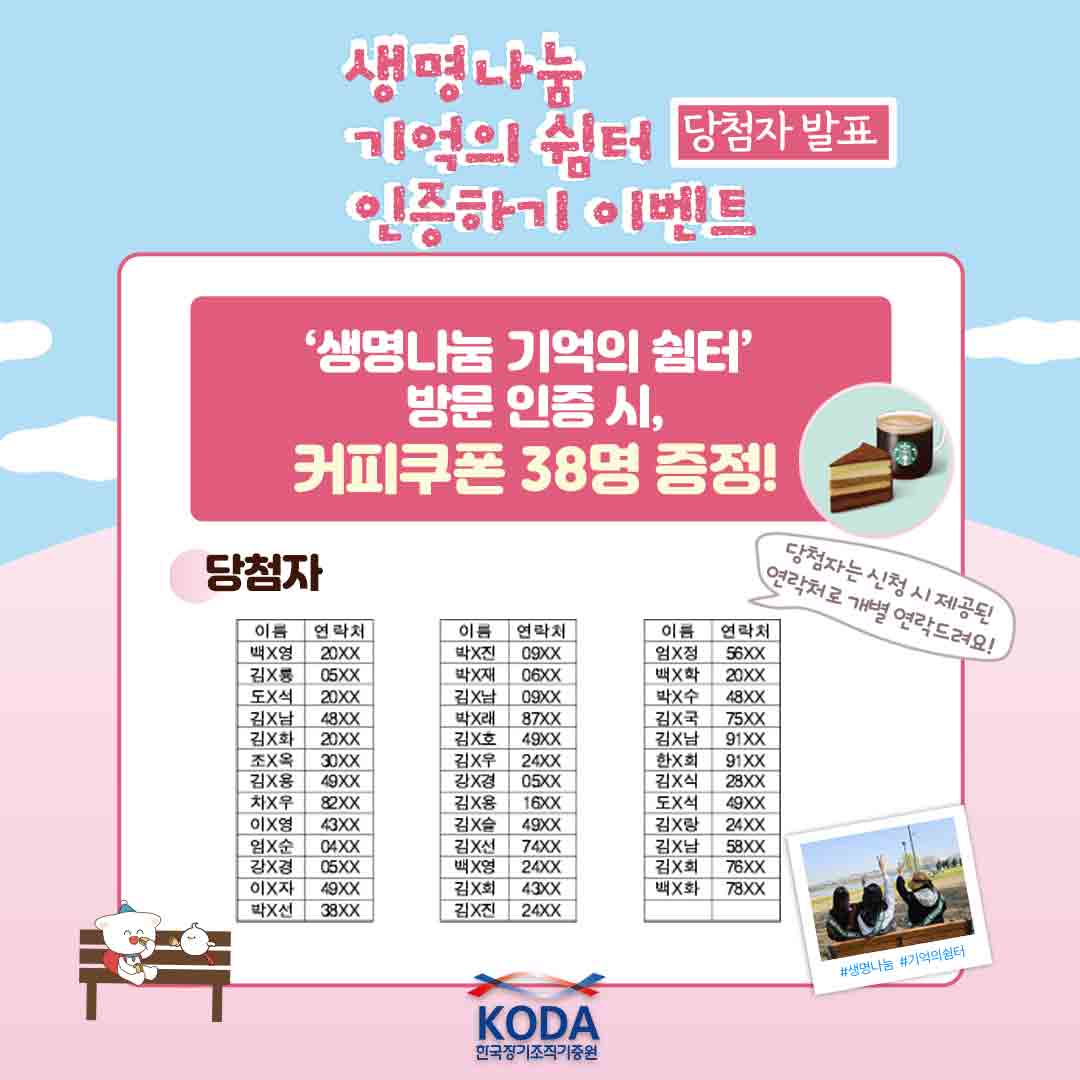생명나눔 기억의 쉼터 인증 이벤트 당첨자를 아래와 같이 공지합니다.
