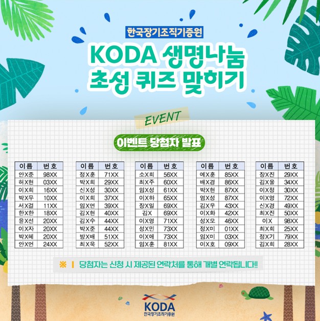 KODA 생명나눔 초성 퀴즈 맞히기 담첨자 발표합니다.